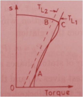 Ahora, aumentamos el par de carga, nuevamente de TL2 a TL1, el punto de operación cambia al punto C. Como la velocidad del motor en C es menor que la velocidad en B, por lo tanto, el punto de operación B es estable. También tenga en cuenta que en este caso, la variación de velocidad en B y C es menor, por eso decimos que el punto de operación entre s=0 y s= sMT es más estable.