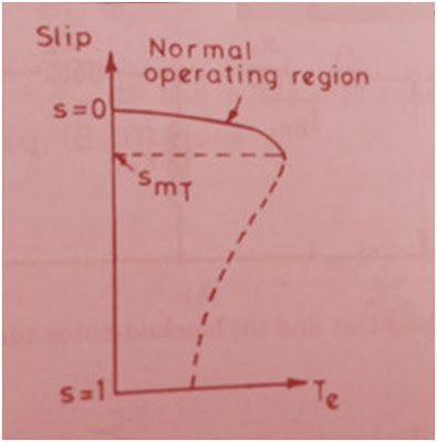 La figura anterior muestra las características de torsión de deslizamiento de un motor de inducción. La región de funcionamiento normal se muestra de s=0 a s=smT mediante una línea sólida. La región punteada de s=1 a s=smT no se usa para la operación.