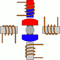 Hay 4 bobinas con un ángulo de 90° entre sí fijadas en el estator. La forma en que se interconectan las bobinas, finalmente caracterizará el tipo de conexión del Motor Paso a Paso. En el dibujo anterior, las bobinas no están conectadas entre sí. El motor anterior tiene un paso de rotación de 90°. Las bobinas se activan en un orden cíclico, una por una según el pulso de entrada. La dirección de rotación del eje está determinada por el orden en que se activan las bobinas. La animación anterior muestra este motor en funcionamiento. Las bobinas se activan en serie, con un intervalo de aproximadamente 1 segundo. El eje gira 90° cada vez que se activa la siguiente bobina.