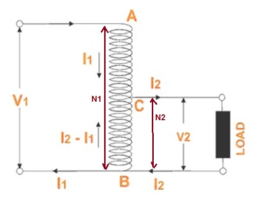 Un transformador, en el que una parte del devanado es común tanto al circuito primario como al secundario, se denomina autotransformador. Cabe señalar que en el transformador de dos devanados, los devanados primario y secundario están aislados eléctricamente, pero en el transformador automático, los dos devanados no están aislados eléctricamente. En la siguiente figura se muestra un diagrama simplificado de un transformador automático reductor.