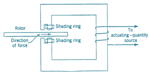 La estructura de polos sombreados, como se muestra en la figura a continuación, generalmente es accionada por la corriente que fluye en una sola bobina en una estructura magnética que contiene un espacio de aire. El flujo del entrehierro producido por esta corriente se divide en dos componentes desfasados y, por lo tanto, se denomina anillo de sombra generalmente de cobre que rodea parte de la cara polar de cada polo en el entrehierro.
