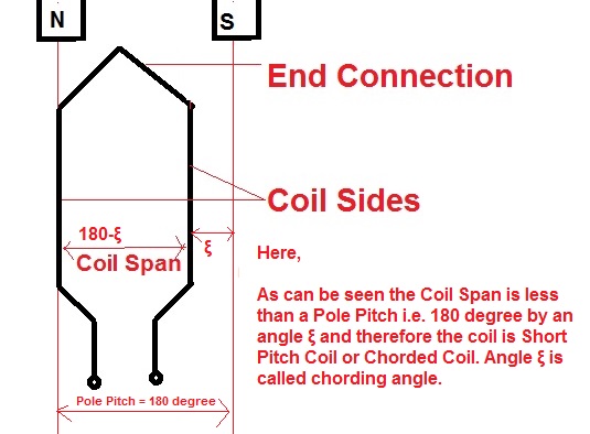 Así podemos definir un Bobina de paso corto como la bobina que tiene un tramo de bobina (Coil Span se define como el ángulo de espacio entre los dos lados de una bobina) inferior a 180 grados. Una bobina de tono corto también se conoce como Bobina Acordeada.